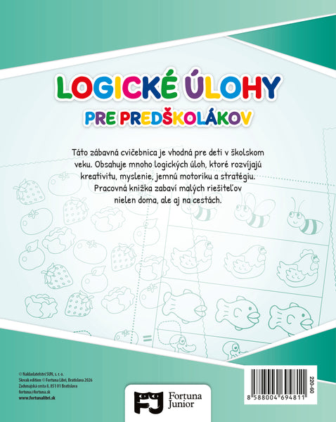 Obsahuje mnoho logických úloh, ktoré rozvíjajú kreativitu, myslenie, jemnú motoriku a stratégiu. Pracovná knižka zabaví malých riešiteľov nie len doma, ale aj na cestách.