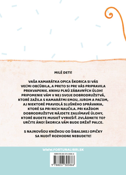 Milé deti! Vaša kamarátka opica Škorica si vás veľmi obľúbila, a preto si pre vás pripravila prekvapenie. Knihu plnú zábavných úloh! Pripomenie vám v nej svoje dobrodružstvá, ktoré zažila s kamarátmi Emou, Jurom a Paľom, aj niektoré pravidlá slušného správania, ktoré sa pri nich naučila. Pri každom dobrodružstve nájdete zaujímavé úlohy, ktoré budete musieť vyriešiť. Zvládnete to? Určite áno! Škorica vám bude držať palce. S najnovšou knižkou od šibalskej opičky sa nudiť rozhodne nebudete !